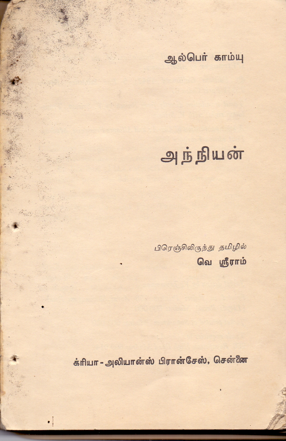 அந்நியன் – ஆல்பெர் காம்யு – பிரெஞ்சு மொழியிலிருந்து தமிழில் வெ ஸ்ரீராம். – வெளியீட்டாளர் : க்ரியா.